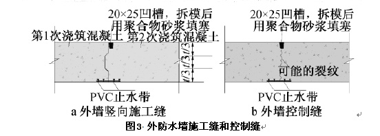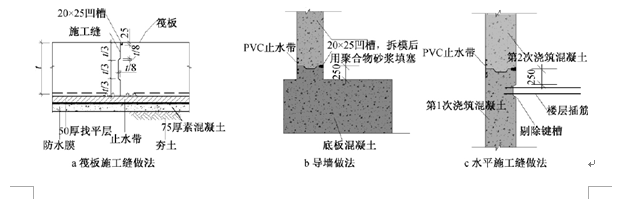 總之,通過(guò)留凹槽和剪斷水平鋼筋形成薄弱截面,通過(guò)增加止水帶來(lái)加強(qiáng)防水。