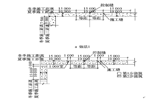 由于影響因素較多,理論上不好確定。目前,還沒(méi)有普遍能接受的方法來(lái)預(yù)測(cè)。但由于其受已澆筏板的約束,肯定比筏板的施工段短。根據(jù)經(jīng)驗(yàn),此距離一般設(shè)為5~7.5m。但每次澆筑5~7.5m,則嚴(yán)重影響施工進(jìn)度,并增加了施工縫處理工序。一般情況下,是把此距離擴(kuò)大1倍,達(dá)到10~15m,并在其中部位置設(shè)置控制縫。所謂控制縫,就是在一個(gè)澆筑段的中部人為地制造一個(gè)薄弱面,當(dāng)混凝土開(kāi)裂時(shí),引導(dǎo)裂縫出現(xiàn)在該部位。本工程施工圖紙要求的施工段間距為,冬季15m,夏季10m。同時(shí),在每段中部設(shè)置控制縫。如圖1a所示。注意下段混凝土的澆筑與上段混凝土的澆筑時(shí)間間隔至少要差36h,以便上段混凝土充分收縮。當(dāng)不能滿足該條件時(shí),按圖1b設(shè)置后澆帶。
