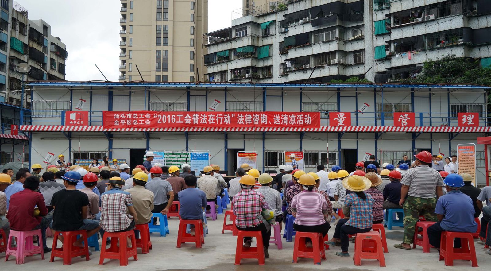 盛夏已到,高溫來襲,這給各行業(yè)作業(yè)人員帶來諸多的影響,尤其是奮戰(zhàn)在建筑施工現(xiàn)場的作業(yè)人員容易疲勞及中暑,為進(jìn)一步關(guān)心現(xiàn)場作業(yè)人員的身心健康,汕頭市總工會、金平區(qū)總工會聯(lián)合我司于6月30號在建設(shè)項(xiàng)目施工現(xiàn)場舉行 “2016工會普法在行動”法律咨詢、送清涼活動。