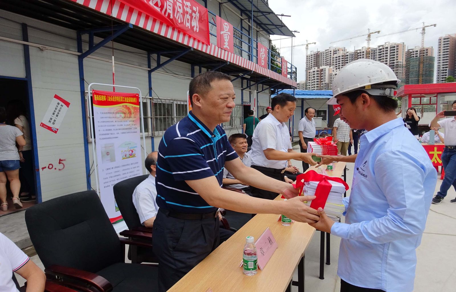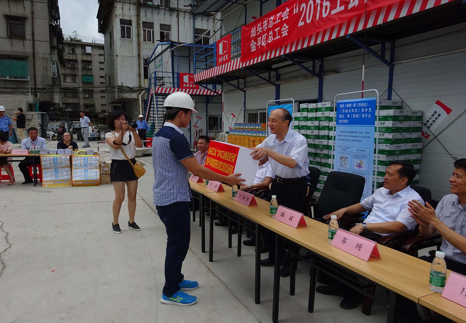 汕頭市人大常委委會副主任、汕頭市總工會主席王揚(yáng)澤同志,汕頭市總工會黨組成員、副調(diào)研員章二禧同志,金平區(qū)人大常委副主任、金平區(qū)委副書記陳斌同志、區(qū)總工會主席蘇純同志、汕頭市總工會法律工作部部長王曉南同志等領(lǐng)導(dǎo)以及公司董事長林錦平來到建設(shè)項(xiàng)目施工現(xiàn)場,親切關(guān)懷和了解施工人員的工作生活情況,再三叮囑他們在夏季高溫時(shí)段工作時(shí)一定要注意作業(yè)安全,預(yù)防中暑,并將清涼飲料以及法律書籍送到他們手中,對他們付出的辛勤勞動表示感謝和慰問。
