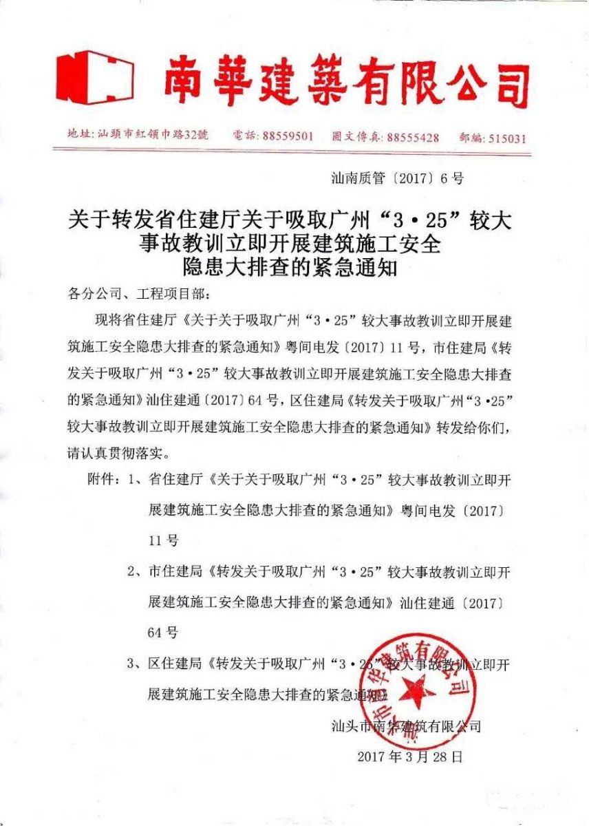 3月28日,公司組織公司職員、在建項目部負責人以及相關(guān)人員召開安全生產(chǎn)緊急會議,認真貫徹落實省、市、區(qū)、各級政府安全生產(chǎn)工作緊急會議精神、建設(shè)主管部門關(guān)于《吸取廣州“3.25”較大事故教訓(xùn)立即開展建筑施工安全隱患大排查的緊急通知》文件精神。會議上,公司部門負責人對承建的在建項目的安全及進度情況進行匯報,分析工程施工上需嚴格加強防范的各個重大危險源,指導(dǎo)安全生產(chǎn)技術(shù)措施,提出具體安全安排措施,本次檢查按照文件要求進行了建筑施工安全隱患大排查,也再次對文件精神進行傳達貫徹,要求各項目按照以下要求切實抓好公司安全生產(chǎn)工作:
