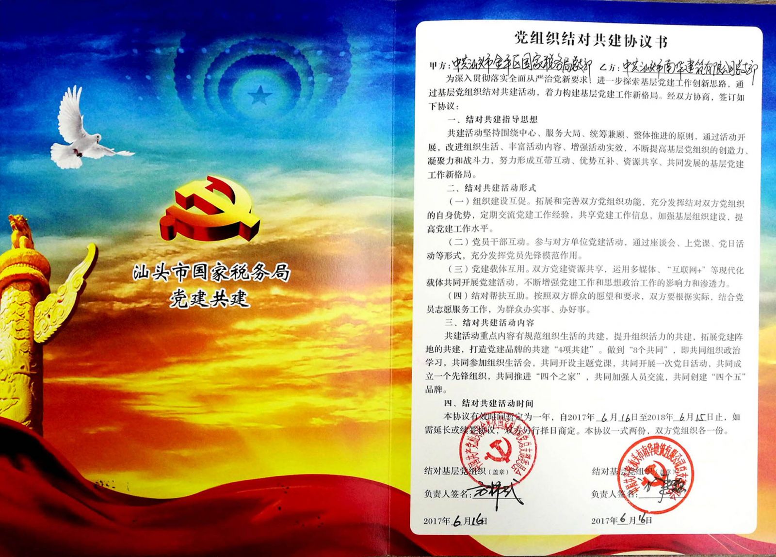 金平區(qū)國家稅務(wù)局黨總支部與我司黨總支部正式簽訂結(jié)對(duì)共建協(xié)議書,并向我司贈(zèng)送“黨建共建單位”稱號(hào)及一批稅收政策書籍和稅收宣傳資料。
