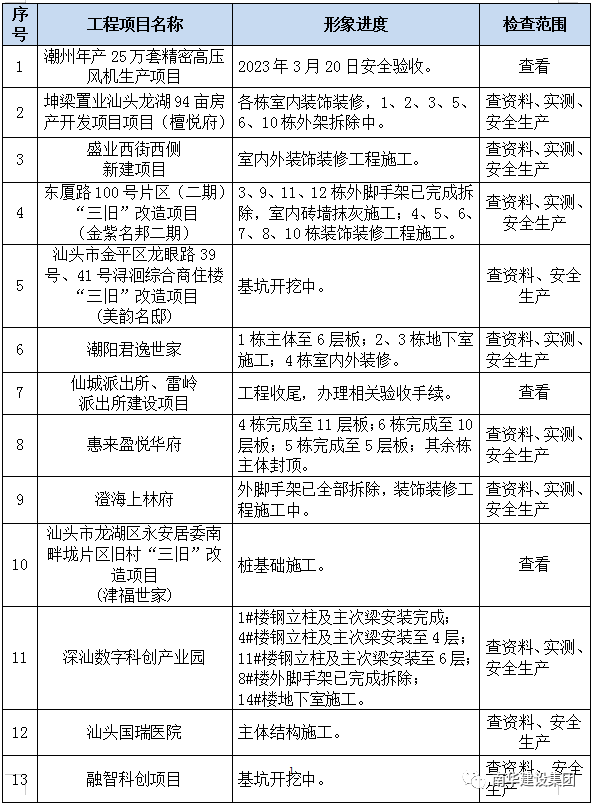 本季度正值于歲末年初及春節(jié)后復(fù)工復(fù)產(chǎn)重點(diǎn)時(shí)期,根據(jù)《汕頭市住房和城鄉(xiāng)建設(shè)局印發(fā)的關(guān)于開展歲末年初房屋市政工程安全隱患專項(xiàng)整治和督導(dǎo)檢查方案的通知》和《廣東省住房和城鄉(xiāng)建設(shè)廳關(guān)于2023年春節(jié)后房屋市政工程復(fù)工復(fù)產(chǎn)安全防范工作的通知要求》,集團(tuán)公司春節(jié)前對(duì)在建項(xiàng)目建筑起重機(jī)械、高支模、深基坑、高處墜落、預(yù)防坍塌和施工消防安全等工程分別進(jìn)行了專項(xiàng)檢查,要求各在建項(xiàng)目及各分公司應(yīng)落實(shí)全過程消防質(zhì)量管理責(zé)任,要加強(qiáng)施工現(xiàn)場(chǎng)消防安全標(biāo)準(zhǔn)化管理,深入開展專項(xiàng)消防安全排查整治。按要求設(shè)置消防設(shè)施和配備消防器材確保消防設(shè)施器材齊全有效。規(guī)范用火、用電、用氣管理,嚴(yán)格執(zhí)行動(dòng)火審批制度,重點(diǎn)對(duì)宿舍、食堂、辦公室等人員密集和火災(zāi)風(fēng)險(xiǎn)較高場(chǎng)所管控,排查清理不符合防火要求的活動(dòng)板房。