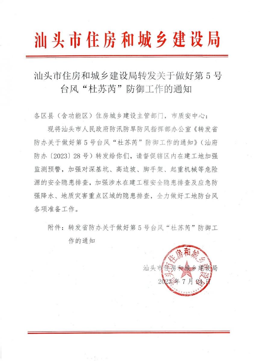 轉發(fā)關于做好第5號臺風“杜蘇芮”防御工作的通知