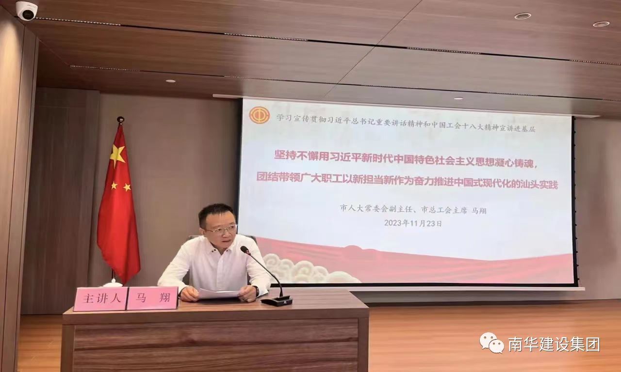 11月23日上午,由汕頭市總工會(huì)主辦、金平區(qū)總工會(huì)協(xié)辦的學(xué)習(xí)貫徹習(xí)近平總書記重要講話精神和中國工會(huì)十八大精神主題宣講活動(dòng)在廣東南華建設(shè)集團(tuán)有限公司舉辦,市人大常委會(huì)副主任、市總工會(huì)主席馬翔出席活動(dòng)并作專題宣講,市、區(qū)總工會(huì)有關(guān)領(lǐng)導(dǎo)同志及我市的中國工會(huì)十八大代表、工會(huì)干部和職工代表參加學(xué)習(xí)。南華建設(shè)集團(tuán)作為金平區(qū)產(chǎn)業(yè)工人隊(duì)伍建設(shè)試點(diǎn)企業(yè),在市、區(qū)總工會(huì)的指導(dǎo)下,公司密切結(jié)合企業(yè)實(shí)際,以黨建帶工建,工建促黨建,凝聚廣大職工力量,匯集廣大職工智慧,把企業(yè)建設(shè)成一個(gè)“和諧發(fā)展、廉潔高效”的堅(jiān)強(qiáng)團(tuán)隊(duì)。我們要認(rèn)真學(xué)習(xí)宣傳貫徹好習(xí)近平總書記重要講話精神和中國工會(huì)十八大精神,充分發(fā)揮工人階級(jí)主力軍作用,大力弘揚(yáng)勞模精神、勞動(dòng)精神、工匠精神,以實(shí)際行動(dòng)推動(dòng)公司走好高質(zhì)量發(fā)展之路。