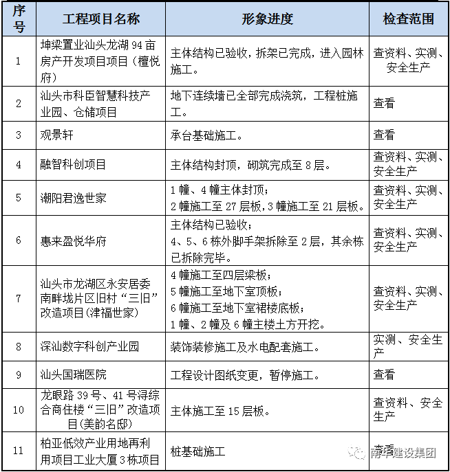 根據(jù)《汕頭市住房和城鄉(xiāng)建設(shè)局印發(fā)的關(guān)于全市城鄉(xiāng)住房建設(shè)領(lǐng)域重點(diǎn)行業(yè)安全生產(chǎn)大檢查的通知》、《關(guān)于做好國務(wù)院安委會(huì)2023年省級(jí)政府安全生產(chǎn)和消防工作考核巡查開展專項(xiàng)排查整治行動(dòng)自查自改工作的通知》的要求、重大安全事故隱患專項(xiàng)排查整治,集團(tuán)公司本季度重點(diǎn)對(duì)在建項(xiàng)目建筑起重機(jī)械、高支模、深基坑、高處墜落、預(yù)防坍塌和施工消防安全等工程分別進(jìn)行了專項(xiàng)檢查,重點(diǎn)檢查以下專項(xiàng)工程的落實(shí)情況:
